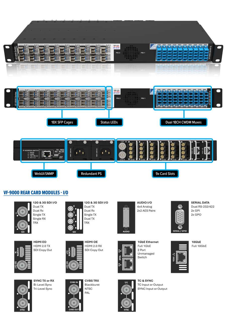 The VF-9000 is a 1 Rack Unit, very high-density video fiber optic transport platform with SNMP monitoring. It has 18 optical I/O (9 or 18 SFP Ports) and can be configured with up to 18 full-size BNCs or 36 HD-BNCs. The system also supports up to 9 1GbE optical extensions provides the user with the option to handle SDI and LAN signals in one frame.